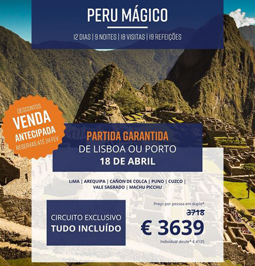 Voos internos: Lima/Arequipa e Cuzco/Lima, em classe económica e em voos regulares LATAM, com direito ao transporte de 1 peça de bagagem até 23 kg